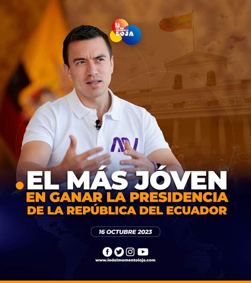 🧒🏻🇪🇨🏆¡Noboa lo logró! Daniel Noboa logra llevarse la segunda vuelta electoral y se convierte en el presidente más joven que ha tenido el Ecuador a sus 35 años (30/11/1987). El requisito principal para ser candidato a la presidencia según la Constitución es 35 años a la fecha de posesión, algo que resultó histórico para el ahora primer mandatario, puesto que el promedio en este país es de 55 años. Su carrera política aún es corta, fue asambleísta por Santa Elena entre 2017 y mayo 2023.