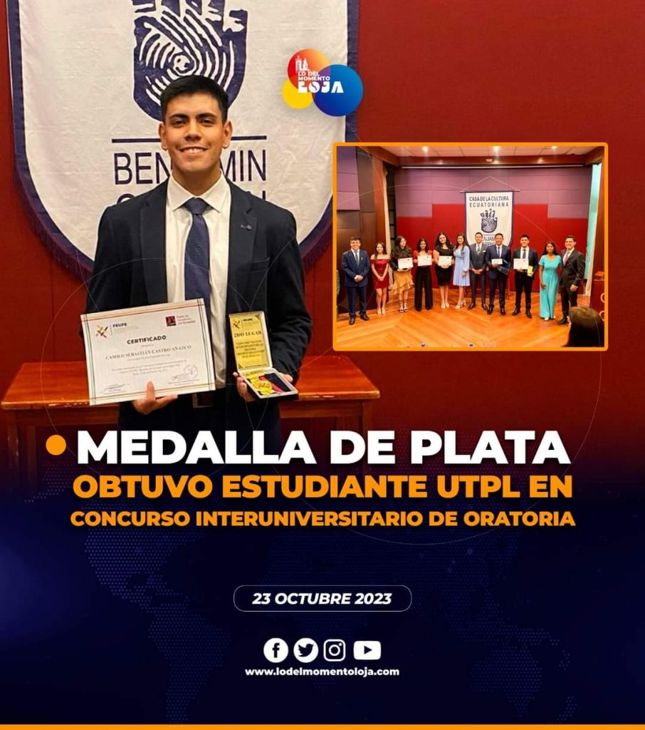 👏🏻🥈🧍🏻 ¡Orgullo UTPL! Camilo Castro, estudiante de la carrera de Derecho en la UTPL, logró una destacada participación tras alcanzar el segundo lugar en un concurso de oratoria al que asistieron estudiantes de todo el país, dejando en alto a la UTPL, cómo una de las instituciones líderes en materia de expresión oral y el arte declamatorio.