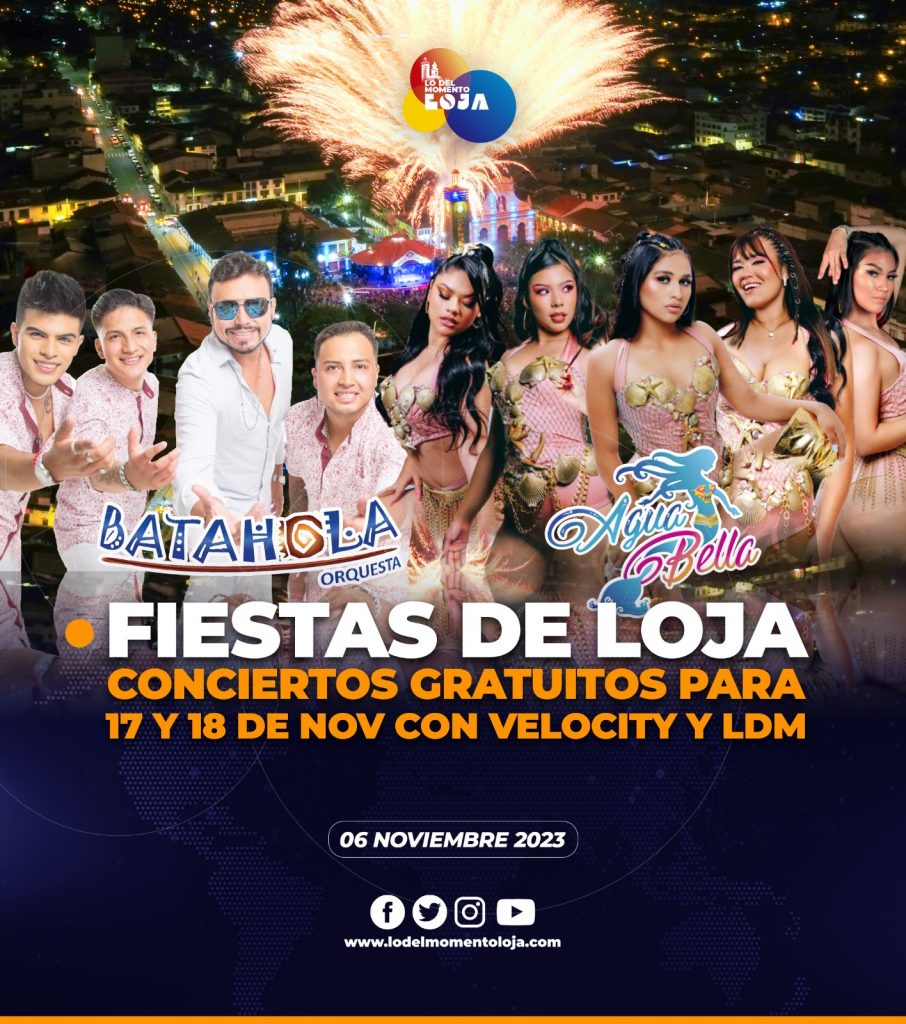 🥳👏🏻🧑🏻🎤 ¡Conciertos gratuitos en Loja! En Loja se celebrarán sus fiestas de noviembre gracias al apoyo de la empresa privada con eventos gratuitos para toda la ciudadanía, es por ello, este viernes 17 de noviembre llega la Orquesta Batahola por la empresa Velocity y 18 de noviembre por el medio digital LDM llega desde Perú la orquesta femenina Agua Bella con toda su música popular.