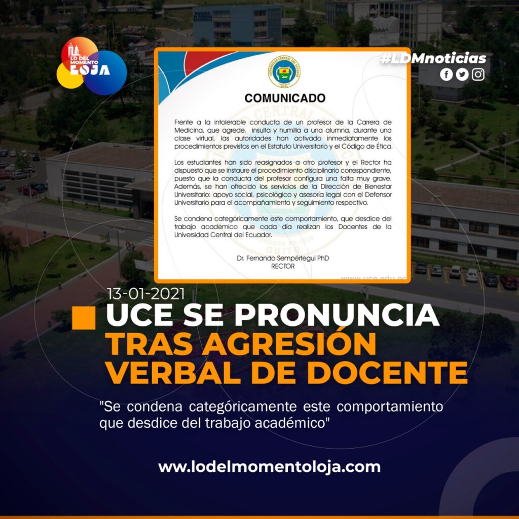 #UIO | El rector de Universidad Central del Ecuador, Fernando Sempértegui, anuncia el procedimiento disciplinario en contra del profesor que agrede, insulta y humilla a una alumna durante una clase virtual.