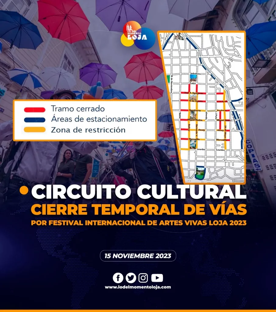 ⚠️🛑🚧 ¡Cierre temporal de vías! Desde el 15 al 25 de Noviembre del 2023, se realizará el VIII Festival Internacional de Arte Vivas Loja 2023, por lo cual habrán cierres de vías en diferentes horarios. Se solicita a los conductores tomar rutas alternas.