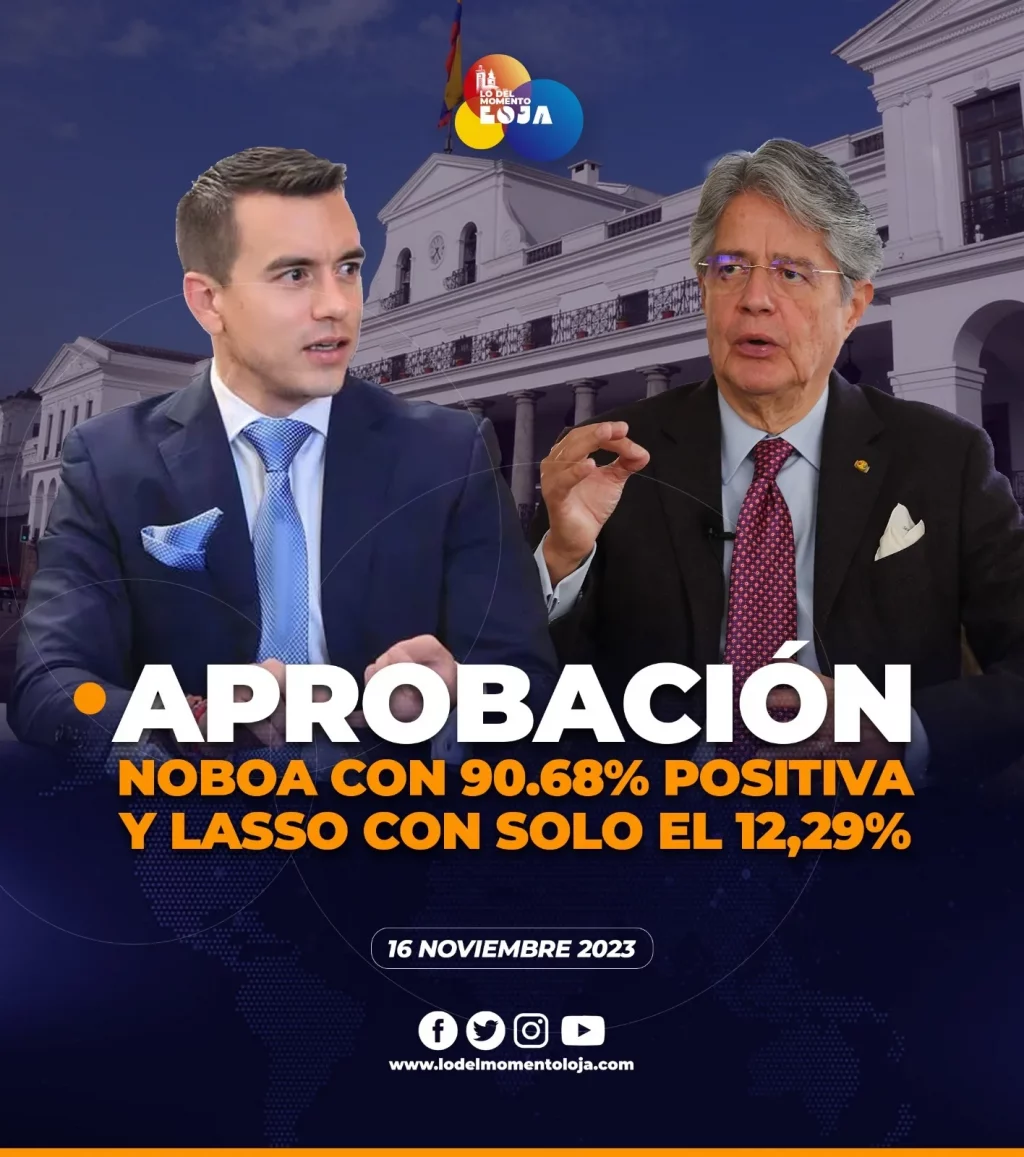 La encuestadora Perfiles de Opinion sitúa en un sorprendente 74.38% el nivel de aprobación de la imagen del presidente electo Daniel Noboa mientras que el mandatario saliente Guillermo Lasso se retira con una calificación de gestión de apenas 12.29% entre muy buena y buena.