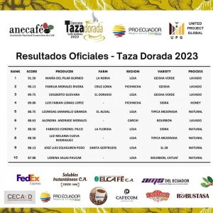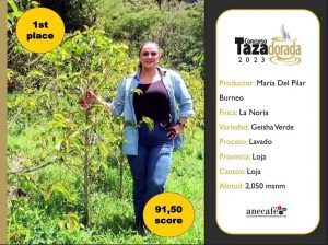 🇪🇨🥇☕ ¡Orgullo Lojano! El café Geisha de la finca La Nora en Loja, bajo la administración de la caficultora María del Pilar Burneo, se destacó con un puntaje impresionante de 91,50 en la décimo séptima edición del evento ‘Taza Dorada’ 2023, celebrado por primera vez en New Jersey, Estados Unidos.