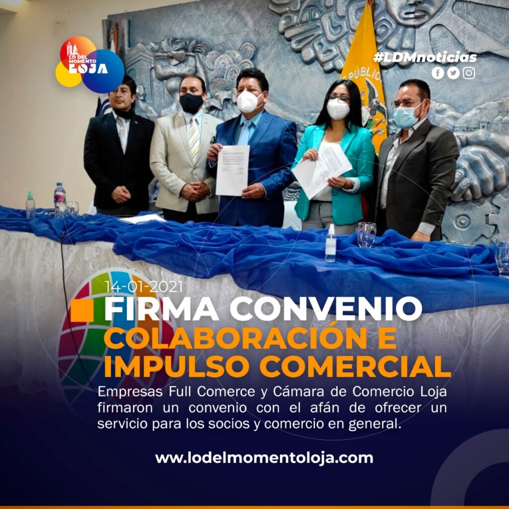 Full Comerce, plataforma Multicomercio y la Camará de Comercio de Loja, firmarón hoy 13 de Enero de 2021 un convenio de colaboración e impulso comercial con el afán de ofrecer un servicio para los socios y el comercio en General.