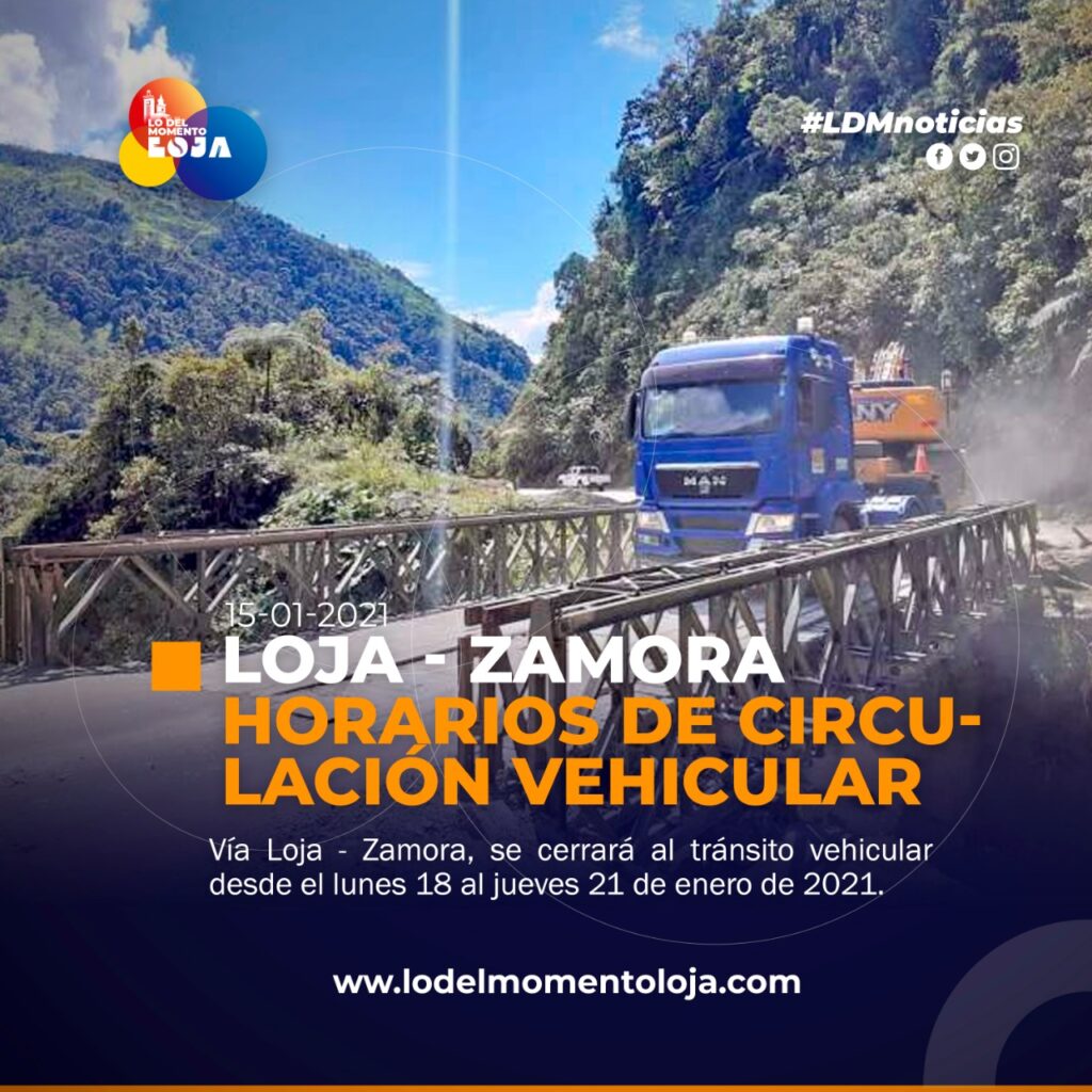 El Ministerio de Transporte y Obras Públicas informa que la vía Loja – Zamora, se cerrará al tránsito vehicular desde el día Lunes 18 hasta el Jueves 21 de Enero de 09h00 a 10h00; 11h00 a 12h00; 13h00 a 14h00; 15h00 a 16h00 y de 17h00 a 18h00, con el afán de dar mantenimiento al puente Bailey sobre la quebrada el Destrozo, ubicado en el kilómetro 45 de la vía Loja – Zamora.