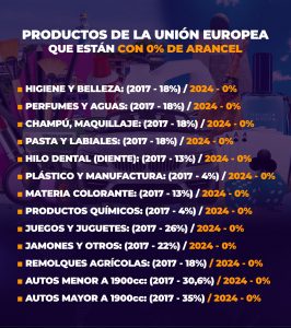 ¡Productos con 0% de arancel! Tras el acuerdo comercial con la Unión Europea (EU) que empezó a regir desde el 1 de Enero del 2017, comenzó la desgravación gradual buscando mejorar el acceso al mercado mediante la reducción o eliminación de aranceles sobre mercancías importantes para el comercio bilateral y después de 84 meses (7 años), el arancel para la importación de los mismos, en su mayoría llegaría a cero.