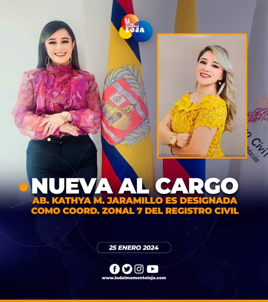 👤👏🏻📄 ¡Nuevo rostro al cargo! La abogada Kathya Mishell Jaramillo es designada como la nueva coordinadora zonal 7 del Registro Civil, Identificación y Cedulación. La también Relacionista pública y actual maestrante de Derecho Penal en UEES en Quito, asumió el cargo de sus funciones, este 25 de enero del 2024.