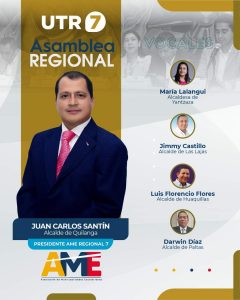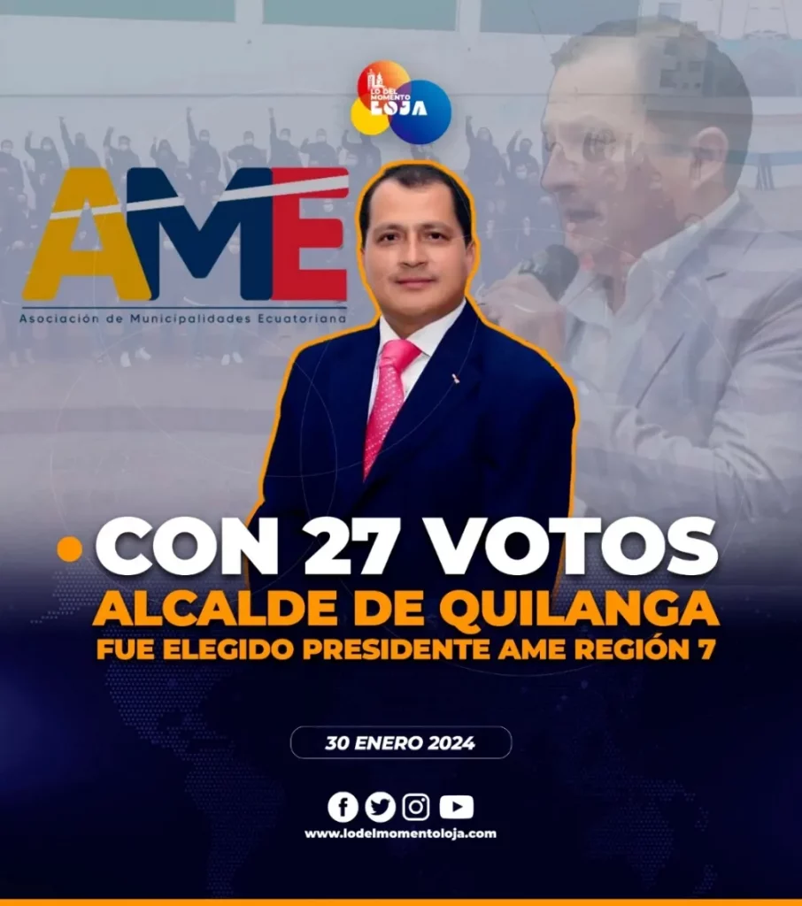 👥👏🏻✅ ¡Hito histórico! Con 27 votos a favor de 39 alcaldes de la Región, el alcalde del cantón Quilanga Juan Carlos Santín, se proclama como el nuevo presidente Regional 7 de la Asociación de Municipalidades del Ecuador(AME).
