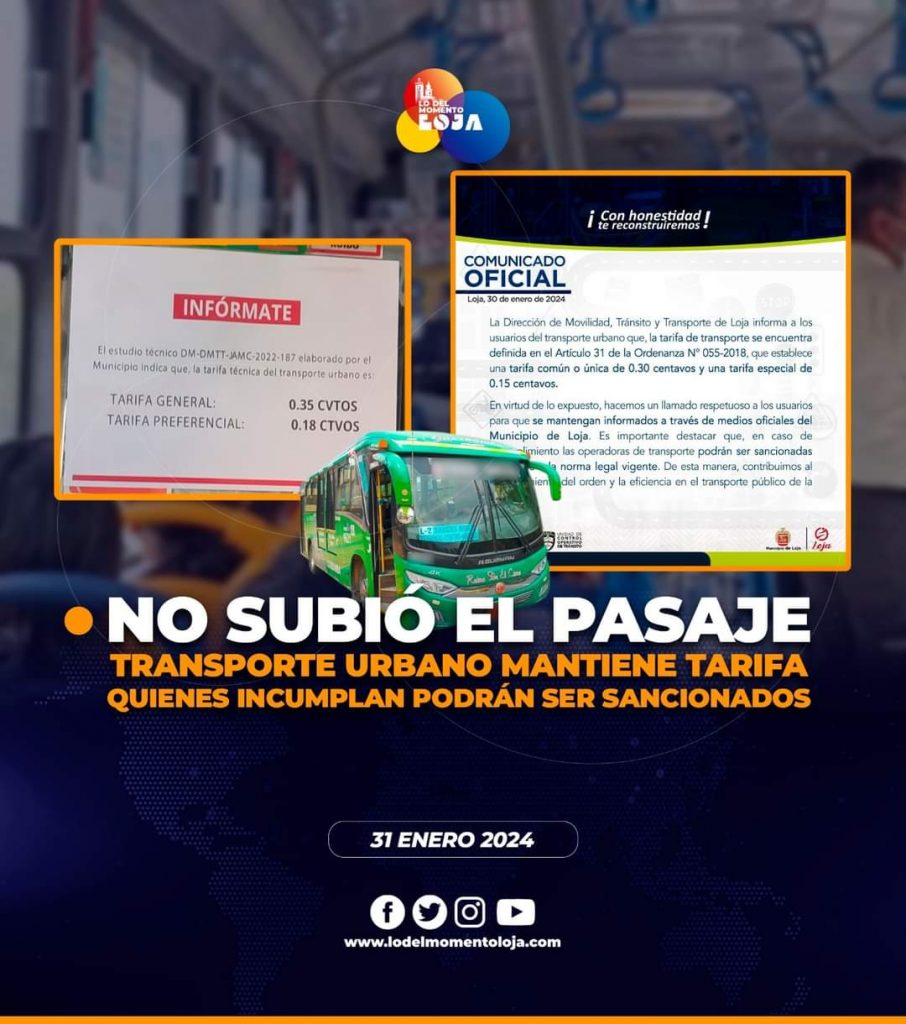 👏🏻🚍💰 ¡No tienen autorización! La Dirección de Movilidad y Transporte anunció a través de un comunicado oficial que según lo establecido por ley en el Artículo 31 de la Ordenanza N° 055-2018, se mantiene la tarifa general de 0.30 centavos y la tarifa especial de 0.15 centavos. Por lo tanto en caso de incumplimiento, las operadoras de transporte podrán ser sancionadas conforme a la norma legal vigente.