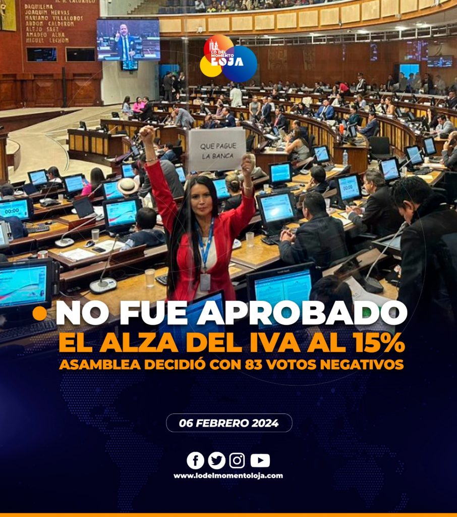 📊👏🏻✅ ¡Una buena decisión! A través de una sesión del pleno, este 06 de febrero de 2024, con un total de 83 votos negativos y 43 votos a favor, la Asamblea no aprobó el incremento del IVA del 12 % al 15 % hasta el 2026, sin embargo los legisladores si aprobaron la contribución temporal de utilidades de bancos y cooperativas de ahorro y crédito. Además con 117 votos a favor dieron luz verde el incremento del Impuesto a la Salida de Divisas ISD al 5%.