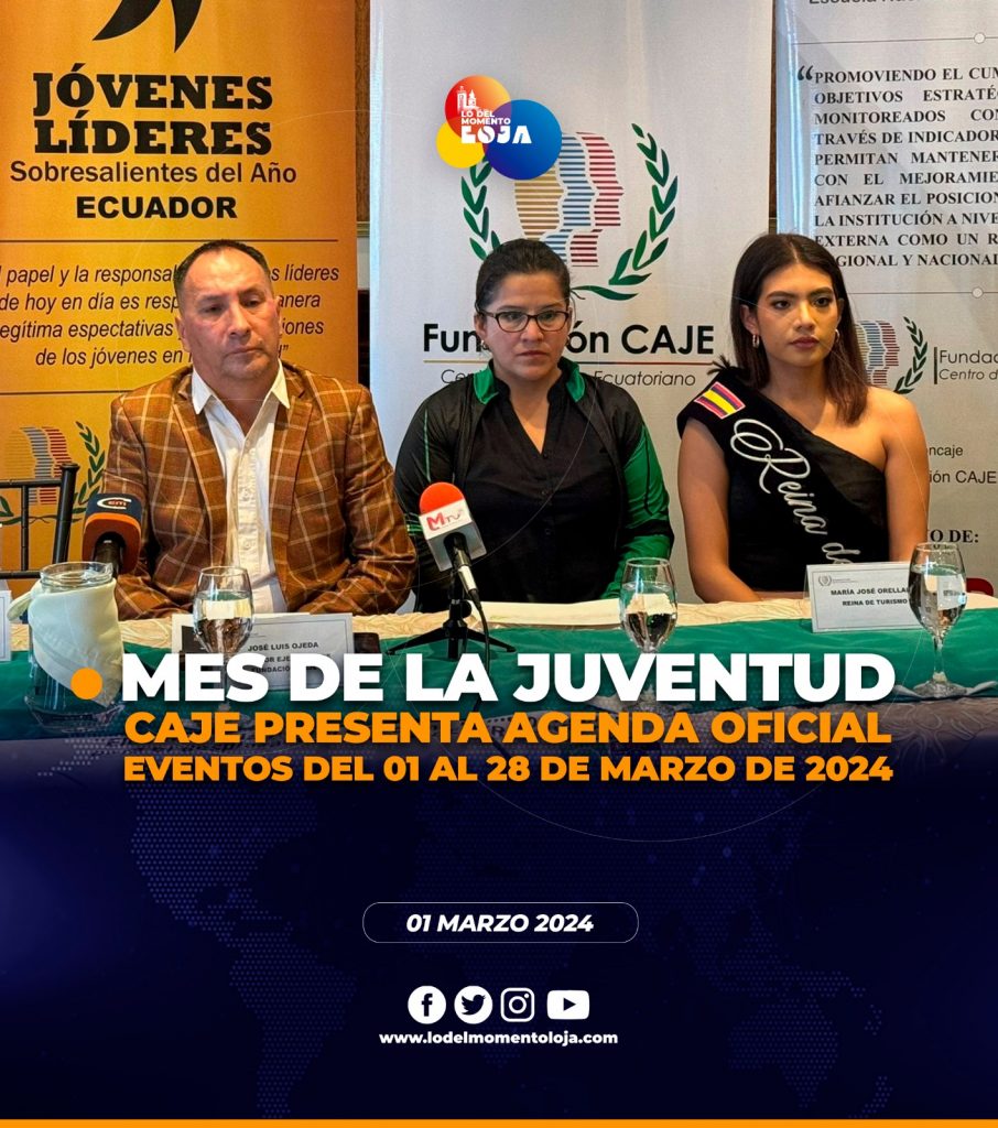 ¡Eventos en el mes! Fundación CAJE, en coordinación con la Reina de Loja, Reina de Turismo y Municipio de Loja, dieron a conocer los diferentes eventos en honor a la juventud lojana, mismos que se llevarán a cabo desde el 01 al 28 de marzo del 2024. Su objetivo es consolidar un espacio público interactivo para fomentar el diálogo intergeneracional en donde puedan intercambiar ideas y conocimientos para mejorar las condiciones de vida.