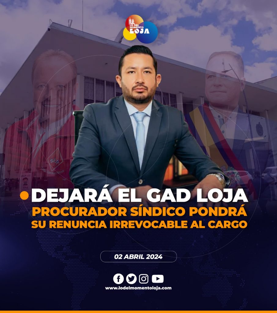 📝💼👋🏻 ¡Se irá un brazo fuerte! El Dr. Max Ochoa, quien se venía desempeñando como procurador Síndico del Municipio de Loja desde que asumió el cargo el Alcalde Franco Quezada a finales de mayo del 2023, presentará su renuncia irrevocable por temas personales, esta acción ya se venía exponiendo hace un mes aproximadamente pero de manera verbal, sin embargo, en pocos días se hará oficial su salida de la institución. LDM se comunicó con el Dr. Ochoa y expresa que “Aún estoy haciendo los informes correspondientes para dejar el cargo, nunca llegué con la convicción de quedarme. En estos días oficializaré mi renuncia”