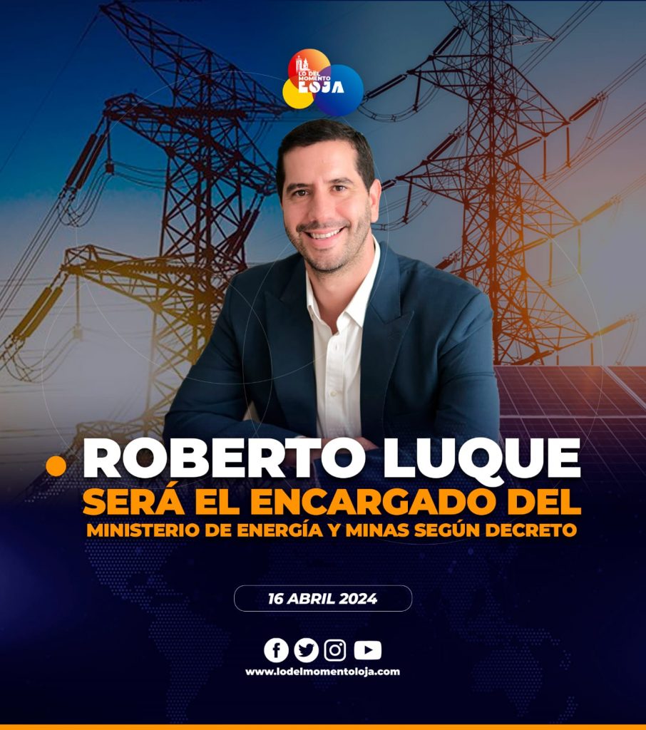 🗣️📄💡 ¡Designación temporal! El actual ministro de Transporte de Ecuador, Roberto Luque, asumirá de manera temporal la Cartera de Energía y Minas, en medio de una crisis del sector eléctrico y cortes de luz, reemplazando a Andrea Arrobo, a quien el Presidente Daniel Noboa pidió la renuncia este 16 de abril.