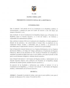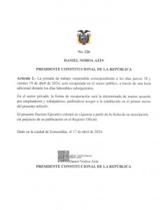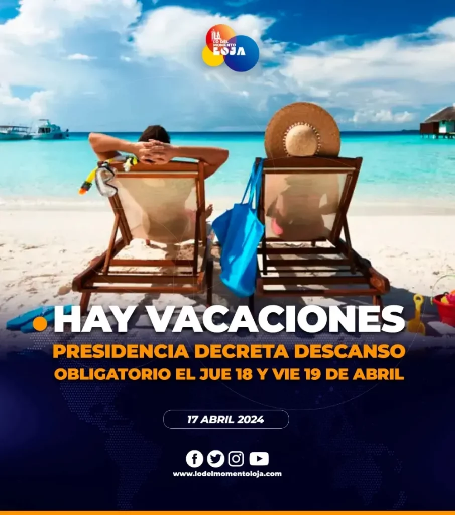 🇪🇨👀🏖️ ¡Vacaciones forzosas! A través del Decreto Ejecutivo N° 226, el Presidente de la República Daniel Noboa, decreta suspender la jornada de trabajo, tanto para el sector público como para lo privado, los días jueves 18 y viernes 19 de abril del 2024.