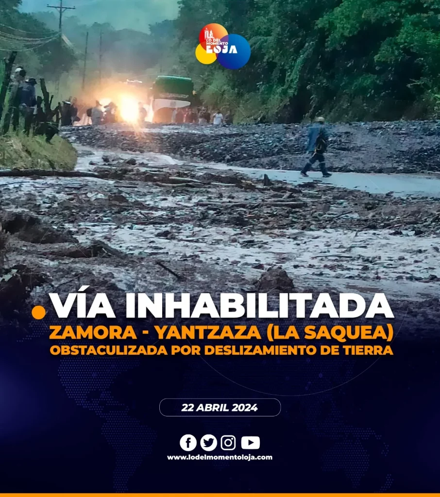🚧🪨🛣️ ¡Tome precauciones! A la altura del sector La Saquea, en la vía Zamora – Yantzaza se registró un deslizamiento de tierra que obstaculiza la vía en su totalidad. Personal de Obras Públicas trabaja en la limpieza y habilitación de la vía.