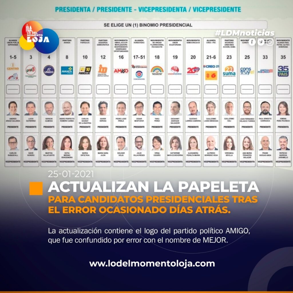 Pero las papeletas de los 16 binomios presidenciales que se han vuelto a imprimir con la corrección del logo del Movimiento Amigo, las papeletas son de color verde. Los 6 millones de papeletas que estuvo con el logo erróneo, la papeleta es de color lila, el CNE han informado que serán destruidas.