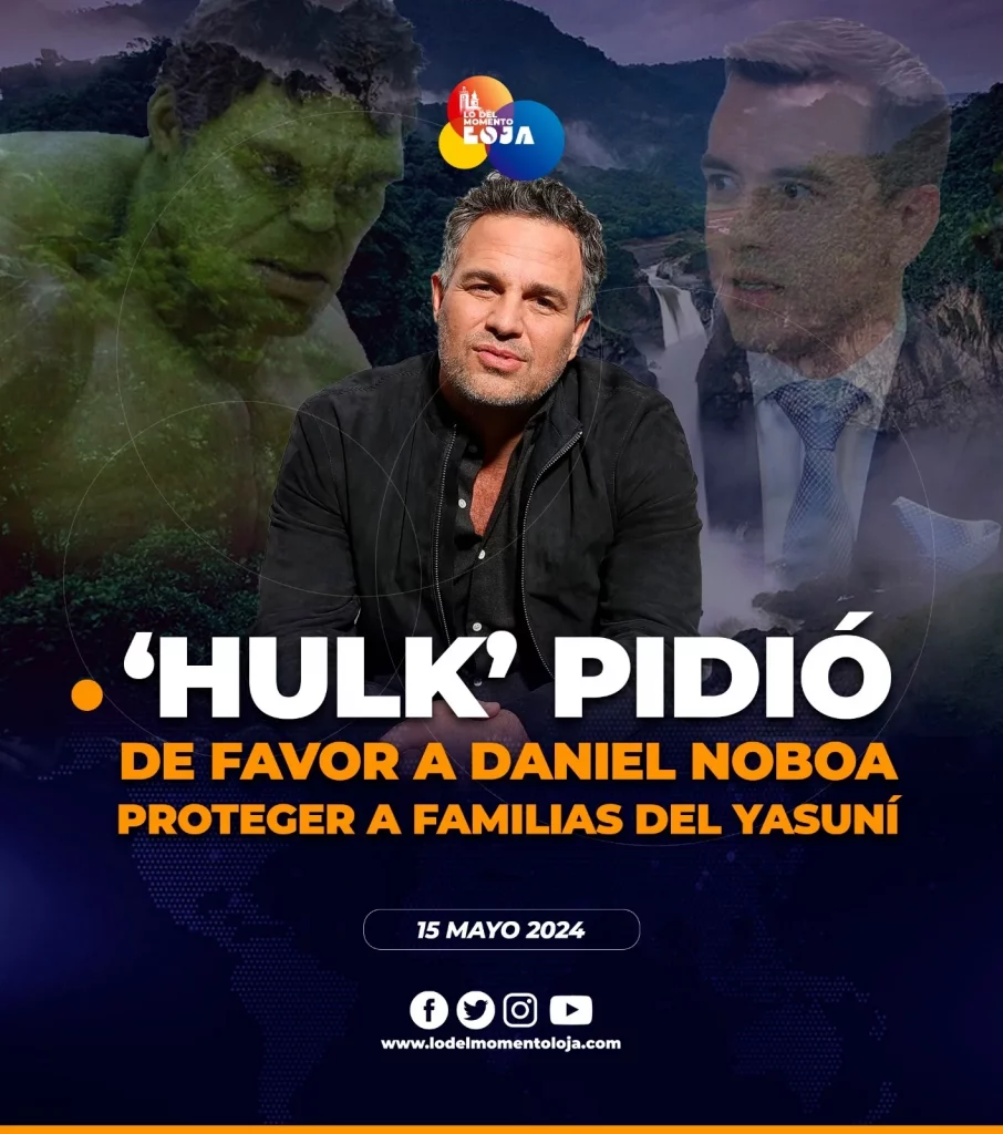 💪🏻🗣️🇪🇨 ¡Haz caso ‘nobita’! A través de su cuenta de X (Twitter), el actor, productor y director estadounidense Mark Ruffalo (más conocido por su icónico personaje de Hulk), hizo un llamado al presidente Daniel Noboa, para que proteja a las madres, familias y niños del bosque del Yasuní, de las peligrosas y destructivas prospecciones petrolíferas.