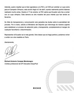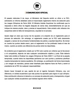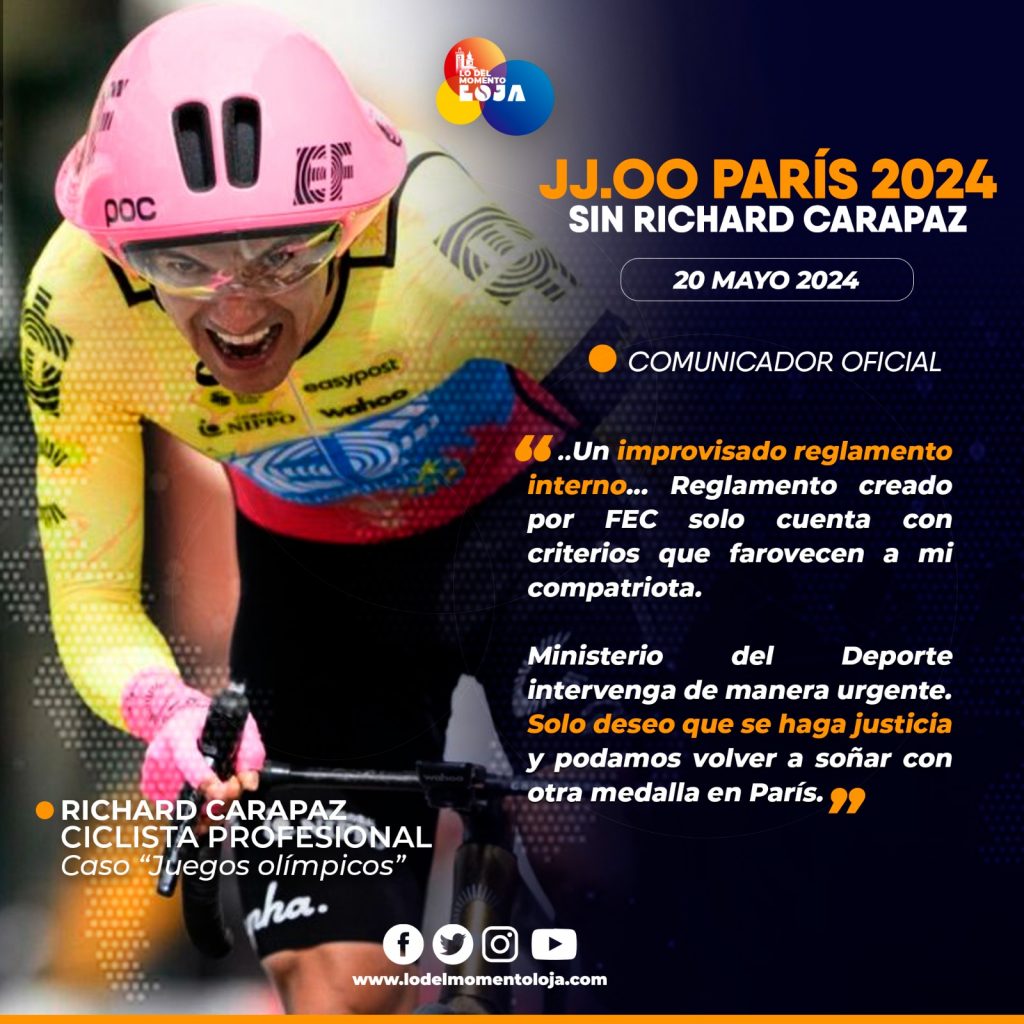 🗣️🚵🏻♂️🏆 ¡Lo quieren dejar fuera! Pese a ser el campeón olímpico vigente y el ciclista que ha conseguido más puntos para lograr un cupo y representar al país en los Juegos Olímpicos de París 2024, el tricolor Richard Carapaz, busca que se realice un proceso de selección justa y transparente. Aludiendo a que el reglamento interno emitido por la Federación Ecuatoriana de Ciclismo (FEC) es totalmente improvisado y con ello, buscan dejarlo fuera y eximir al presidente de dicha institución (FEC) de cualquier responsabilidad, favoreciendo a su compatriota para representar al Ecuador en el certamen.