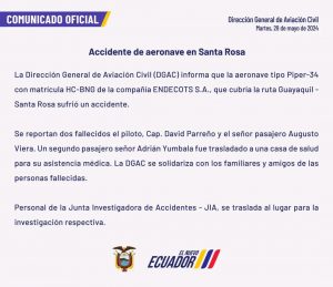 😱✈️💥 ¡Terrible suceso! Una aeronave tipo Piper-34 de la compañía ENDECOTS S.A., sufrió un accidente aéreo mientras cubría la ruta Guayaquil – Santa Rosa y dejó como saldo dos personas fallecidas y una herida. La Dirección Nacional de Aviación Civil confirmó el siniestro, mientras que “personal de la Junta Investigadora de Accidentes -JIA- se trasladó al lugar para la investigación respectiva”.