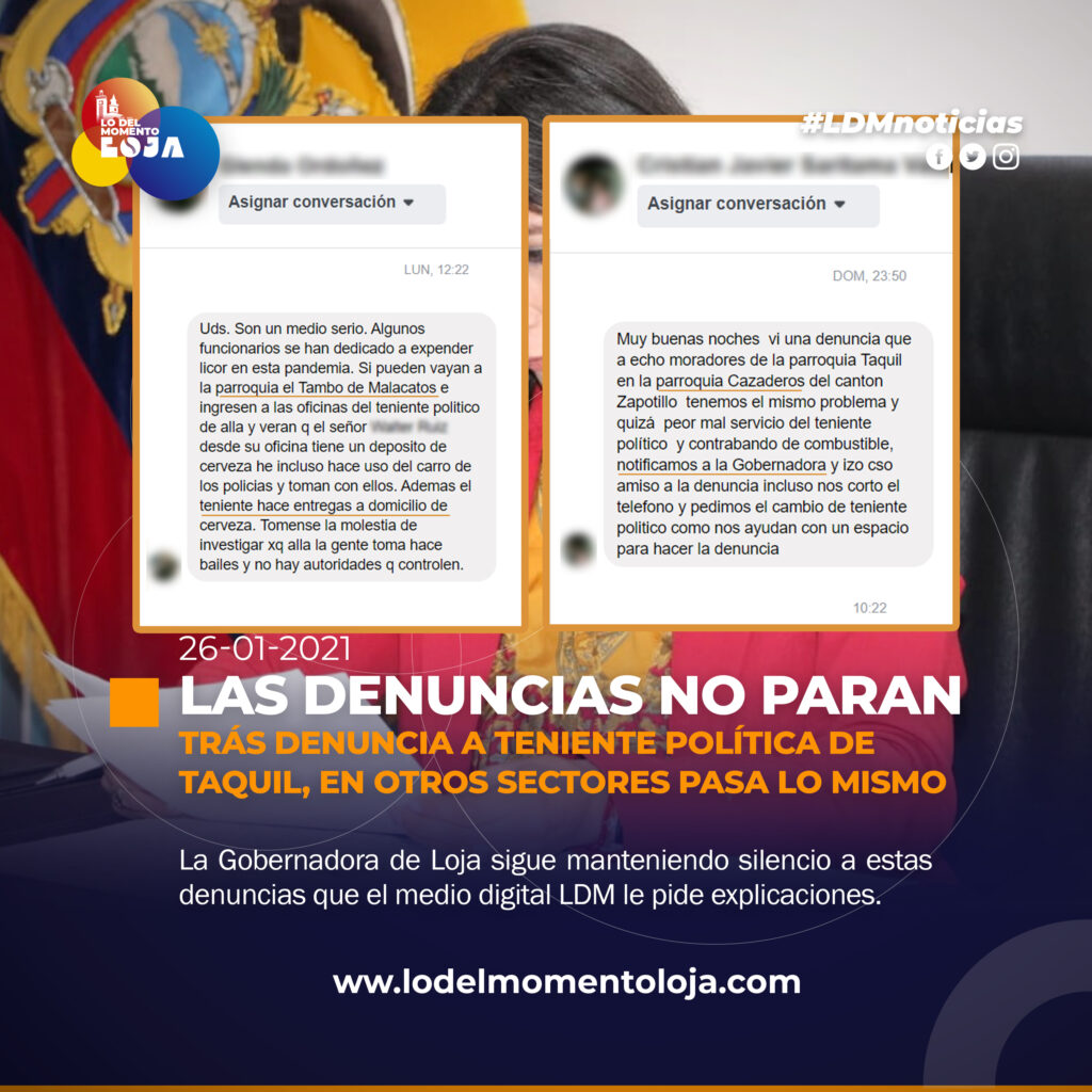 Tras la denuncia pública sobre la actuación de la Teniente Político de Taquil, nuevas denuncias ciudadanas llegan a este medio digital sobre la actuación de funcionarios en diferentes sectores de la provincia de Loja.