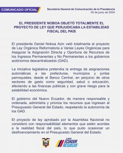 😱🗣️📃 ¡Última decisión! El presidente Daniel Noboa emitió un segundo veto total a la Ley Orgánica Reformatoria a Varias Leyes Orgánicas para Asegurar la Asignación Directa y Oportuna de Recursos de los Ingresos Permanentes y No Permanentes a los Gobiernos Autónomos Descentralizados, con ello la Asamblea Nacional podrá volver a considerar este proyecto legislativo únicamente un año después de la objeción.