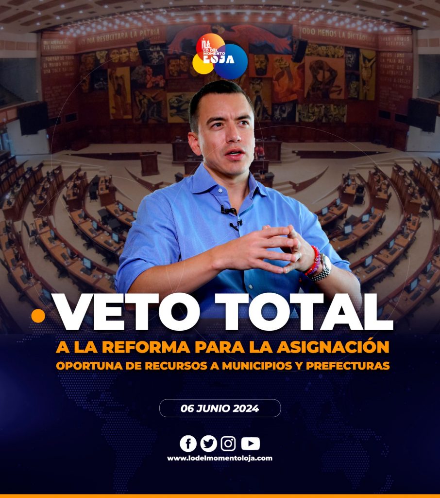 Noboa veta totalmente la reforma para la asignación oportuna de recursos a municipios y prefecturas