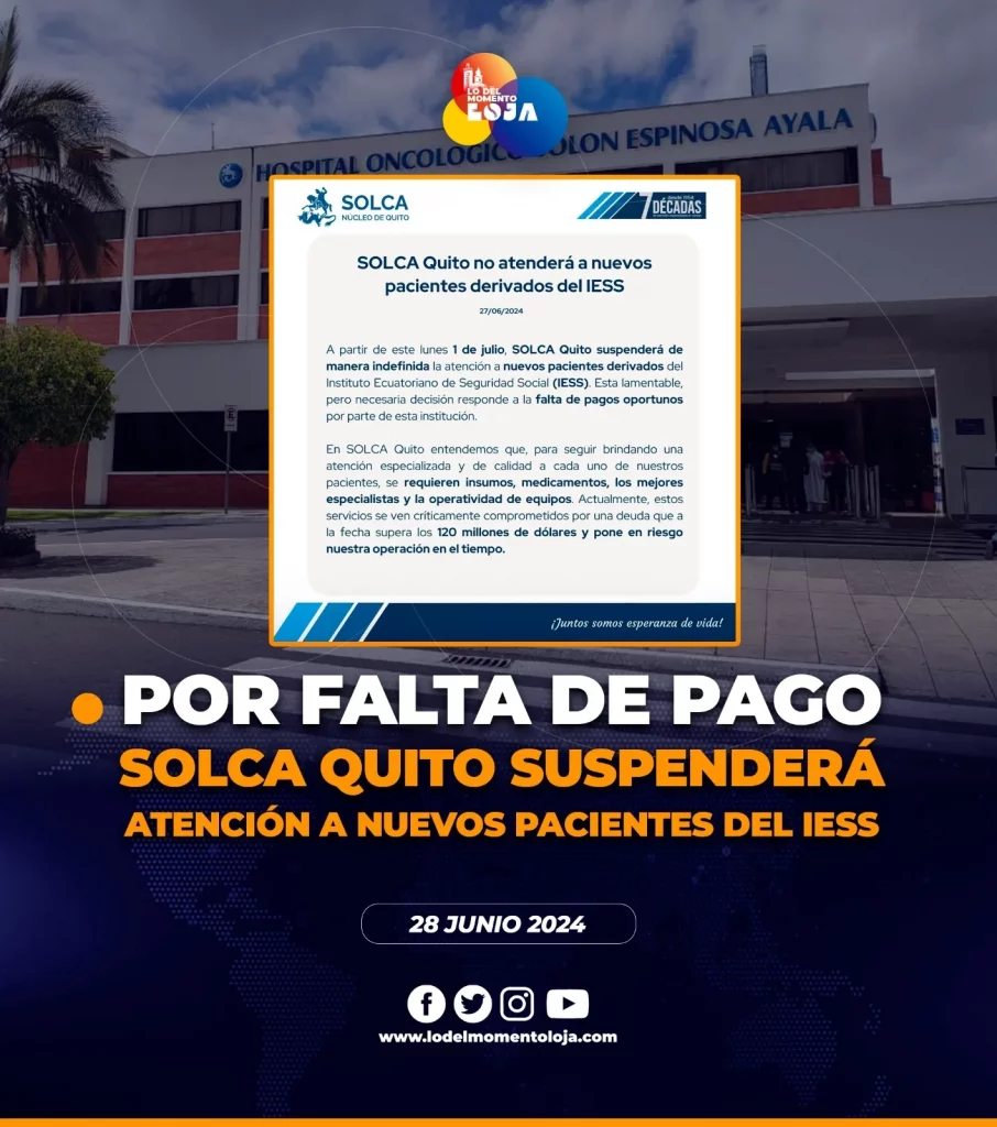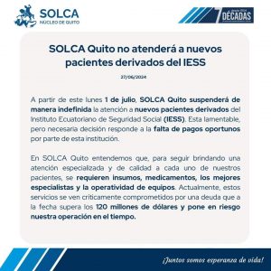 😱🏥👨🏻⚕️ ¡No habrá atención! SOLCA Quito informa a la ciudadanía en general, que a partir del 1 de julio, suspenderán la atención para nuevos pacientes referidos del Instituto Ecuatoriano de Seguridad Social IESS, esto debido a la falta de pagos oportunos por parte de la institución.