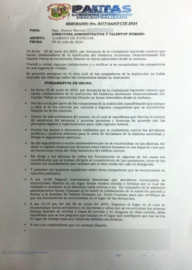 Desde el área de Talento Humano del Municipio de Paltas, el 9 de julio del 2024 se ha emitido un memorando No. 0377-GADCP-CTH 2024 dirigido a la Directora Administrativa y Talento Humano por un llamado de atención.