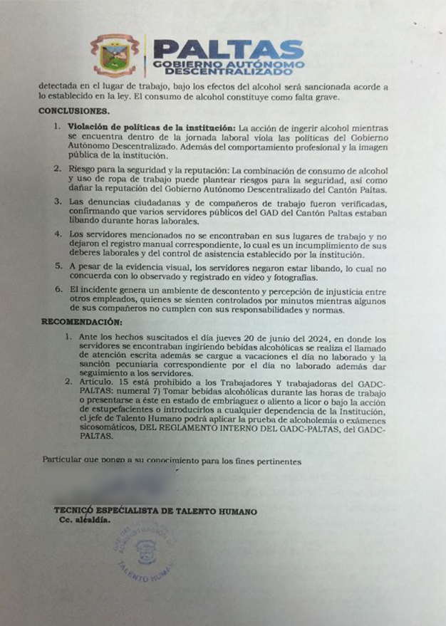 Con fecha 20 de junio del 2024, por una denuncia ciudadana se pudo conocer que varios funcionarios del Municipio de Paltas se encontraban libando en horas laborales de la mañana, al conocer del incidente, el funcionario de carrera procedió a darle seguimiento a varios de los involucrados, estos no se encontraban en las oficinas como corresponde, tampoco habían dejado un registro manual como se lleva desde Talento Humano en hojas de ruta que se encuentran cerca del reloj biométrico del edificio central, es decir, se habían sin justificación alguna pero con el recado de “están en comisión” si preguntaran por ellos.