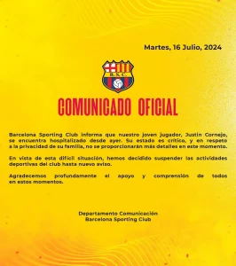 😱🟡⚫ [ACTUALIZACIÓN] Pese a las diferentes notas de pesar por parte de compañeros de equipo, amigos y entidades deportivas, ante el presunto fallecimiento del zaguero Justin Cornejo, el Barcelona Sporting Club (BSC), anunció a través de un comunicado oficial, que el arquero se encuentra hospitalizado y en estado crítico, es por ello que ante esta situación, han decidido suspender las actividades deportivas del club hasta un nuevo aviso.