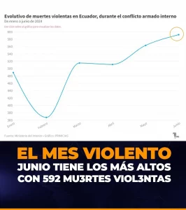 😱📈☠️¡Cifras alarmantes! El mes de junio 2024, ha sido catalogado como el peor y más violento en la historia del país, puesto que datos revelan que en el mismo se han registrado un total de 592 as3s1n4t0s, comparado con el mes de febrero (el incremento de mv3rt3s v10l3nt4s fue del 61,3%). Además entre esos meses (Feb – Jun), en 16 de las 24 provincias habrían aumentado dichas cifras en comparación con años anteriores, liderando esta lista Azuay, Cotopaxi, El Oro, Esmeraldas, Santo Domingo, Sucumbíos, Pichincha y Guayas. Todas ellas debido a la presencia de bandas criminales.