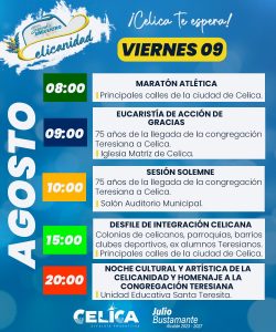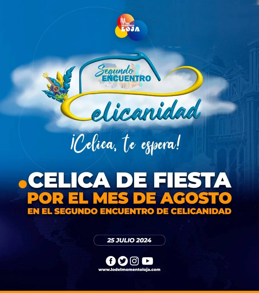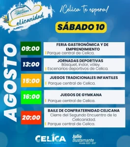 🥳🪗🐄 ¡Fiestas de Celica! En el mes de agosto se desarrollarán actividades en el segundo encuentro de celicanidad, mismos que se realizarán el viernes 09 y sábado 10 de agosto 2024, aquí destacarán jornadas deportivas, desfile de integración, feria de emprendimiento, noche cultural, show con música en vivo, baile de confraternidad y mucho más.