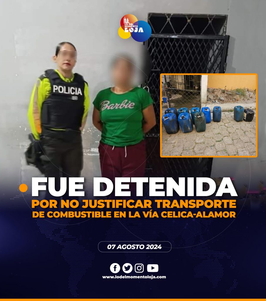 ¡Con las manos en la masa! La Subzona de Policía Loja informa que, a través del Distrito Sabanilla, este 5 de agosto, en cumplimiento a su misión constitucional, ejecutó un operativo en la vía principal que une a los circuitos Celica – Alamor, que permitió aprehender a una ciudadana, retener el automotor y comprobar en presunto delito de tráfico de combustible.