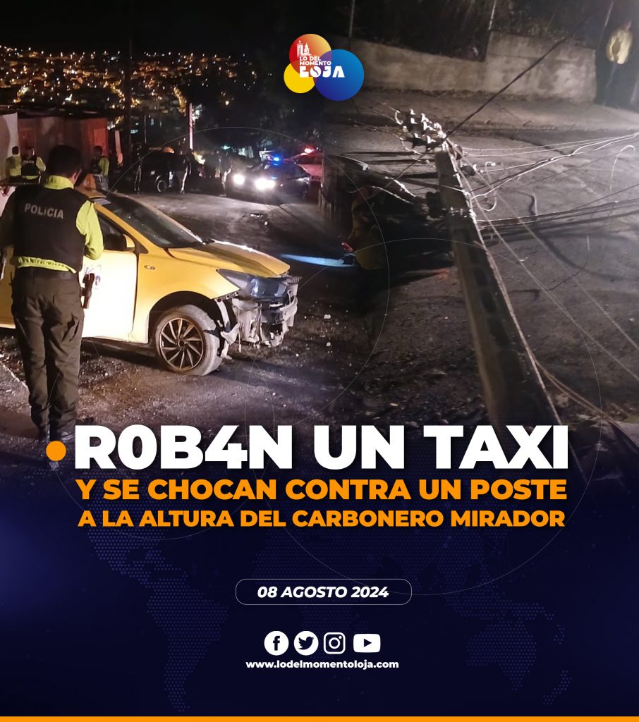 😱💥🚖 ¡Terrible suceso! En horas de la madrugada de este 08 de agosto, tres sujetos habrían robado una unidad de taxi en la urbe de la ciudad y en su huida tras una mala maniobra por la calle Santa Mariana de Jesús (por el Carbonero Mirador), se impactan contra un poste de alumbrado público, dejando como saldo cuantiosos daños materiales y estructurales. Tras el choque, dos de los sujetos implicados fueron capturados y puesto a órdenes de la autoridad competente, mientras que el tercero se dio a la fuga.