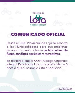 🔥🙄🚒 ¡Cuidado se canse! A pesar de que otras autoridades provinciales, como el caso del Azuay, Lloret, prohibieron de manera tajante la quema con fines agrícolas y pecuarios el 31 de agosto; mientras tanto en Loja, la situación no pasó mas de un exhorto por parte del representante del COE Provincial con Mario Mancino a la cabeza y pidió a todos los municipios de la provincia de Loja que hagan ordenanzas para respectiva restricción del uso del fuego con fines antes mencionados.