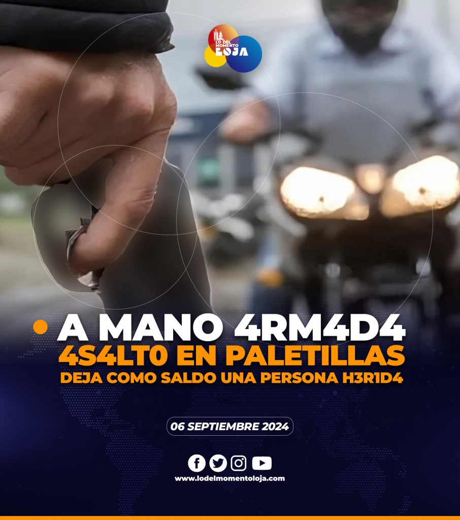 ¡Terrible suceso! En horas de la mañana de este 06 de septiembre, dos sujetos quienes se trasladaban en una moto, intentaron r0b4r a mano 4rm4d4 a un ciudadano de El Sauce (parroquia Paletillas) que se movilizaba en su motocicleta. Tras h3r1rl0 con impactos de b4l4, procedieron a darse a la fuga. Extraoficialmente se conoce que el h3r1d0 fue trasladado con el apoyo de la comunidad y autoridades de la parroquia a una casa de salud de la ciudad de Machala.![]()