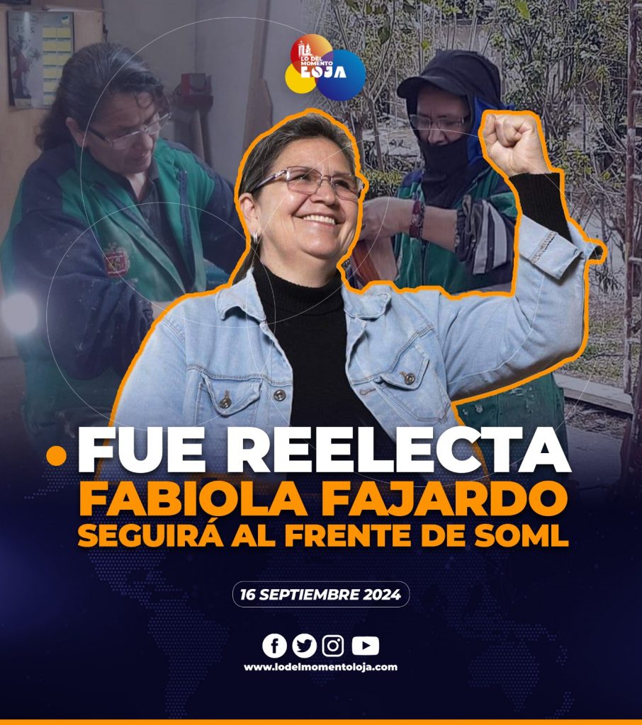 👏🏻🙋🏻♀️🗳️ ¡Se les fue de largo! El domingo 15 de septiembre en las urnas del Centro Cultural Municipal Alfredo Mora Reyes, el Sindicato de Obreros Municipales de Loja (SOML) reeligió a Fabiola Guadalupe Fajardo Pineda (Lista A) como Secretaria General del gremio, con un total de 464 votos a favor, para liderar el SOML por un periodo de dos años más. Dicho posicionamiento se realizará el próximo 28 de septiembre. Fabiola es conocida entre sus compañeros por su incansable lucha en favor de la dignidad laboral, siendo figura clave en la defensa de los derechos de los trabajadores.