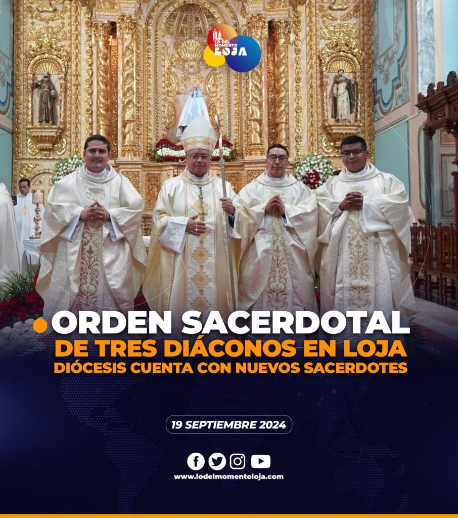 ⛪🔔🕊️ ¡Nuevos sacerdotes! A través de una misa especial, la Diócesis de Loja celebró la ordenación sacerdotal de tres diáconos: Marco V. Abad , Christian F. Macas y Elías G. Montaño. Durante esta solemne ceremonia, el Monseñor Walter Heras presidió el rito de imposición de manos y la oración consagratoria, para los que serán nuevos sacerdotes en la religión católica.