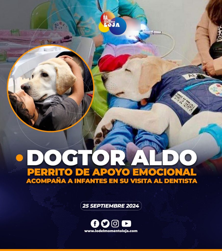 🐶🩺🐾¡Una gran ayuda! Aldo, un perro entrenado para ser apoyo, conocido como ‘Dogtor Aldo’, ha ganado popularidad en redes sociales por ser el acompañante de niños en el Centro de Odontología Infantil ‘Parque Dental’ en Quito, Los Valles y Guayaquil. El can se recuesta en calma sobre las piernas de los pequeños pacientes durante sus consultas, ayudando a reducir el estrés y hacer la visita al dentista más agradable.