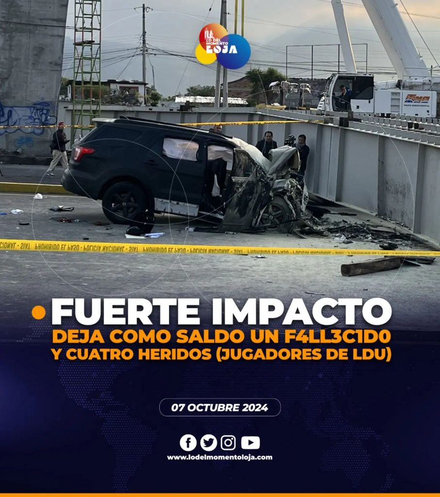 😱💥🚘 ¡Tr4g1c0 final! Un siniestro de tránsito se registró en la Autopista General Rumiñahui, a la altura del puente 8, a las 04:00 de este lunes 7 de octubre del 2024. Suceso que dejó como saldo una persona f4ll3c1d4 (conductor del vehículo), además varios jugadores de Liga Deportiva Universitaria están involucrados en este siniestro. Hasta el momento se conoce que cuatro figuras del equipo albo están heridos y de manera extraoficial se conoce que Marco Angulo estaría hospitalizado con pronóstico reservado.