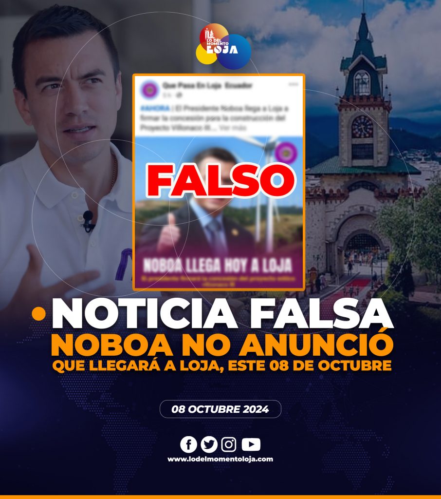 🚫🗣️🙅🏻♂️ ¡Buscan desviar la atención! Tras el anunció en redes sociales no oficiales sobre la presencia del primer mandatario Daniel Noboa en Chuquiribamba (Loja), presuntamente para firmar la concesión para la construcción del Proyecto Villonaco III, esto es totalmente FALSO. La secretaria de Comunicación de la Presidencia del Ecuador no ha informado, la llegada del presidente, para dicho acto.