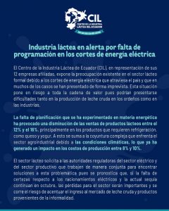 🐮😩📉 ¡Ya basta freezer! Los apagones siguen generando consecuencias terribles, ahora, la industria láctea del Ecuador informa que debido a los apagones hay una disminución de las ventas entre el 12% y el 16%. Adicionalmente, exponen que por las condiciones climáticas, en el sector agroindustrial los costos de producción aumentaron entre el 8% y 10%, por lo que solicitan reunión urgente con autoridades reguladoras del sector eléctrico y productivo.