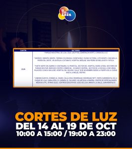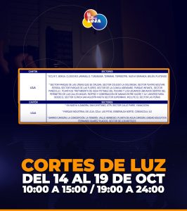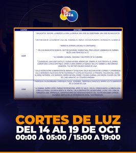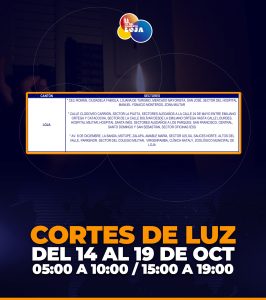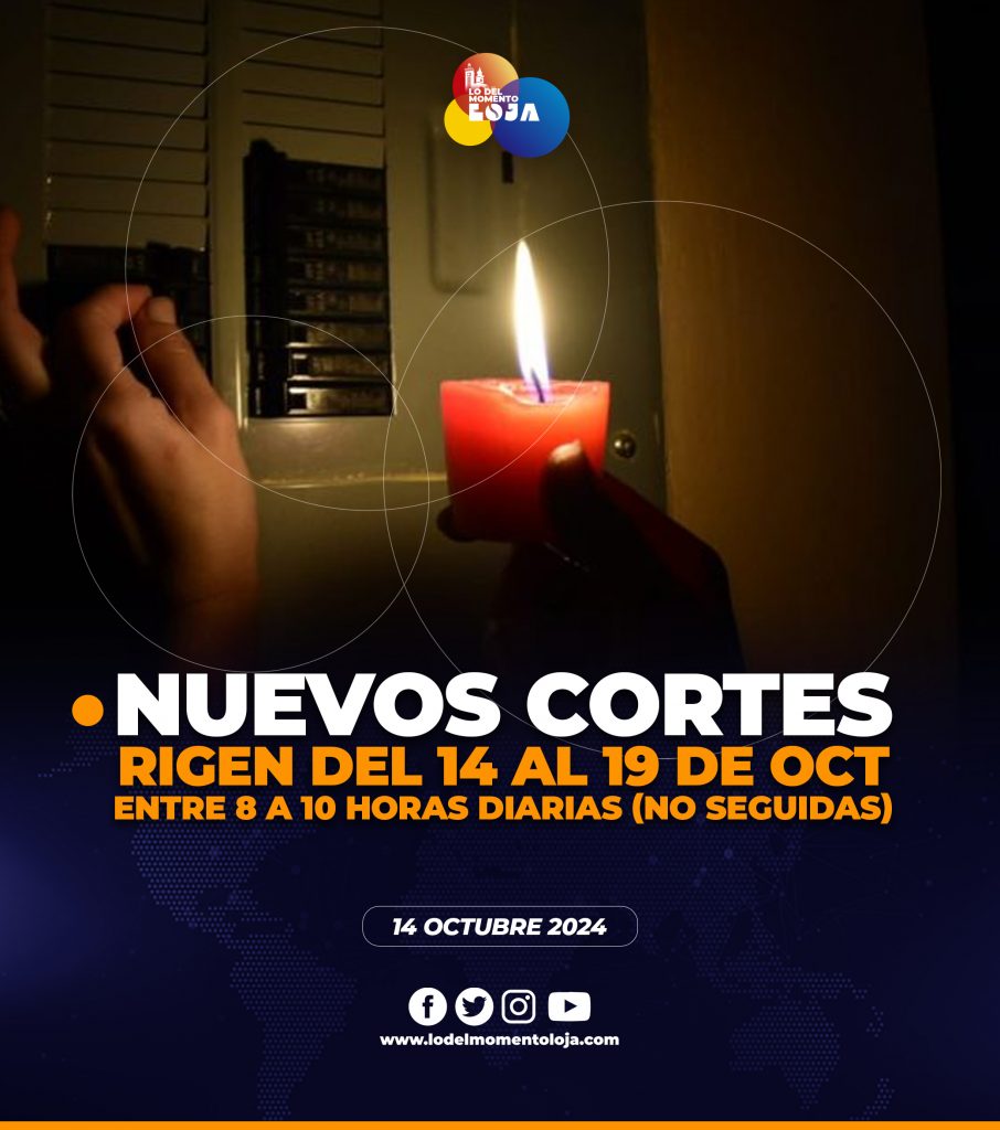 💡🚨📝 ¡Siguen los cortes! La Empresa Eléctrica Regional del Sur S.A. (EERSSA) da a conocer los nuevos cronogramas de corte de energía eléctrica, que rigen desde este 14 al 19 de octubre de 2024 en los diferentes sectores de Loja.