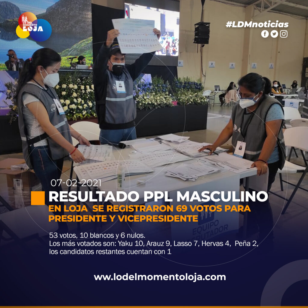 En Loja se han registraron un total de 69 votos de los PPL Masculinos para presidente y vicepresidente, los cuales se han dividido en 53 votos válidos, 10 votos blancos y 6 votos nulos.