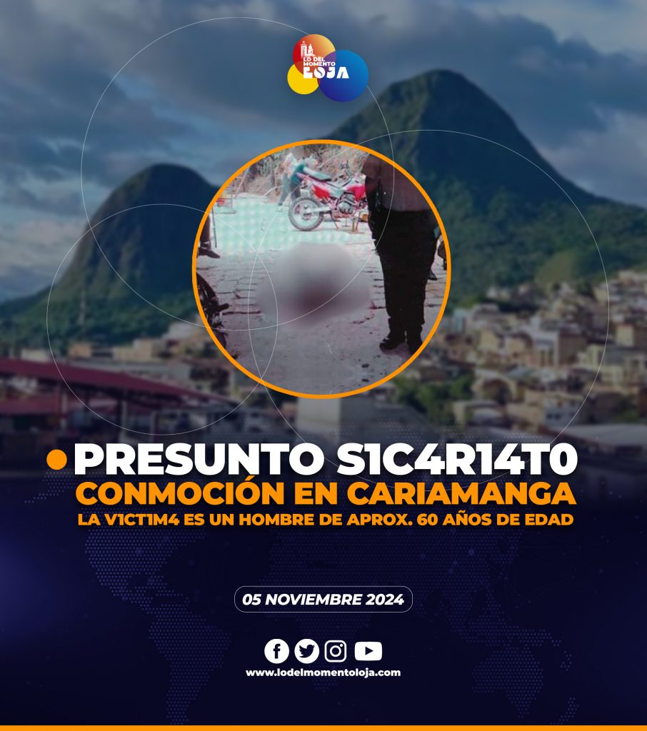 😱🚨✝️ ¡Cariamanga en alerta! En horas de la mañana de este 05 de noviembre, a la altura de las calles Juan Francisco Ontaneda entre Bernardo Valdivieso y José Miguel Rosillo, en el barrio San Vicente, se registró el hallazgo del cuerpo sin v1d4, de un hombre de aproximadamente 60 años de edad, producto de una mv3rt3 v10l3nt4, dejando a la comunidad en un profundo estado de conmoción. Autoridades locales buscan esclarecer los hechos y dar con los responsables de este acto v10l3nt0.