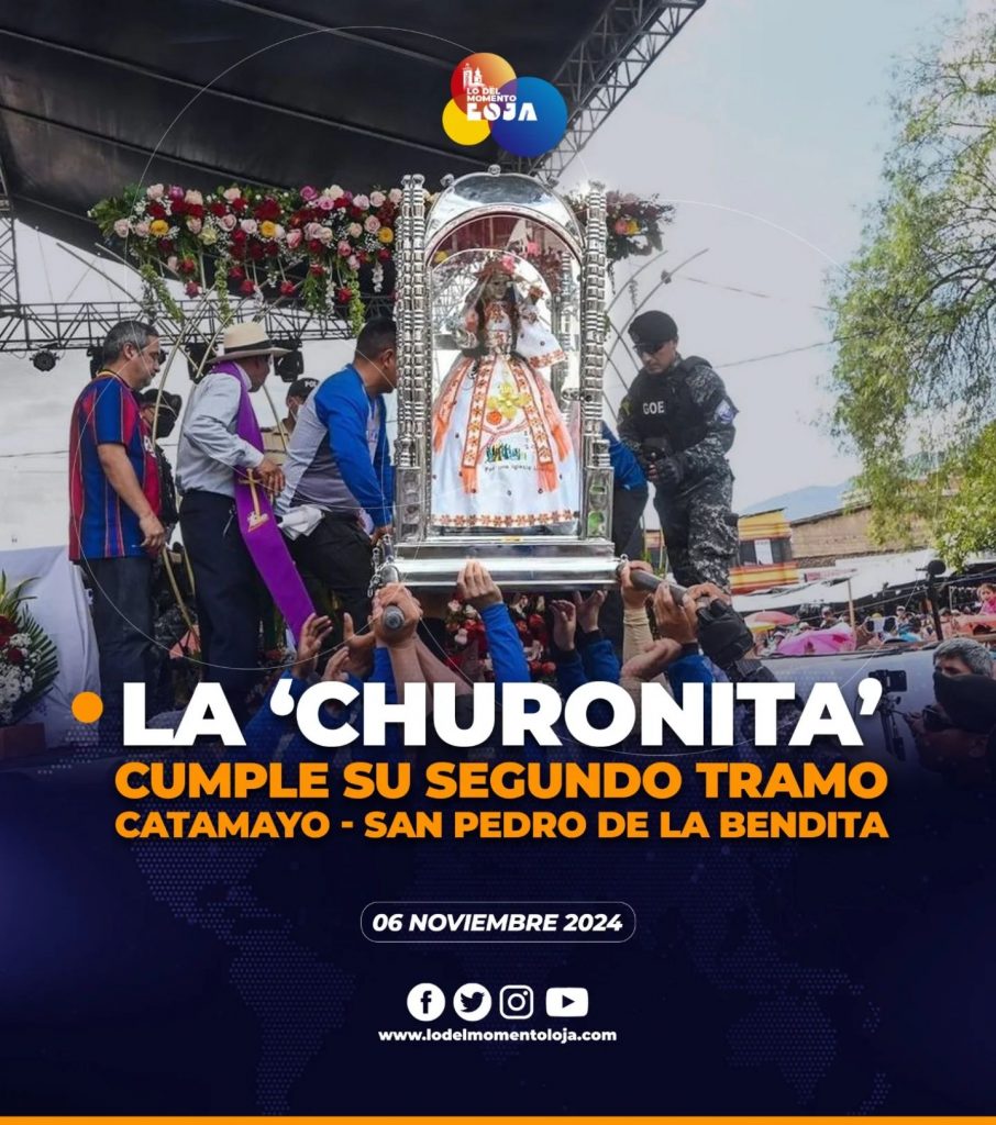 ¡Rumbo a su santuario! La sagrada imagen de la Virgen de El Cisne, salió desde Catamayo rumbo a San Pedro de la Bendita, como parte de su segundo recorrido. Se prevé que La Churonita arribe a Trapichillo, alrededor de las 13h00, lugar en donde se celebrará una eucaristía en su honor y continúe su camino, para finalmente llegar a San Pedro, pasadas las 16h00.