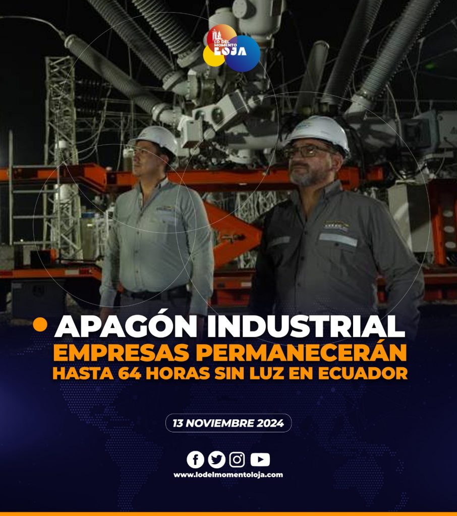 😱🏭💡¡Las industrias se apagan! Los parques industriales de Izamba y Cepia en Ambato, no cuentan con energía eléctrica, desde las 17h00 del pasado 12 de noviembre y se extenderá hasta las 09h00 del viernes 15, acumulando un total de 64 horas continuas sin luz. De igual manera se aplicará en zonas industriales del sur y norte de dicha ciudad, pero a partir de este 13 de noviembre. Por su parte en Quito y el Valle de Los Chillos, las zonas industriales se ven afectadas por cortes de siete a catorce horas, según el cronograma de cortes.