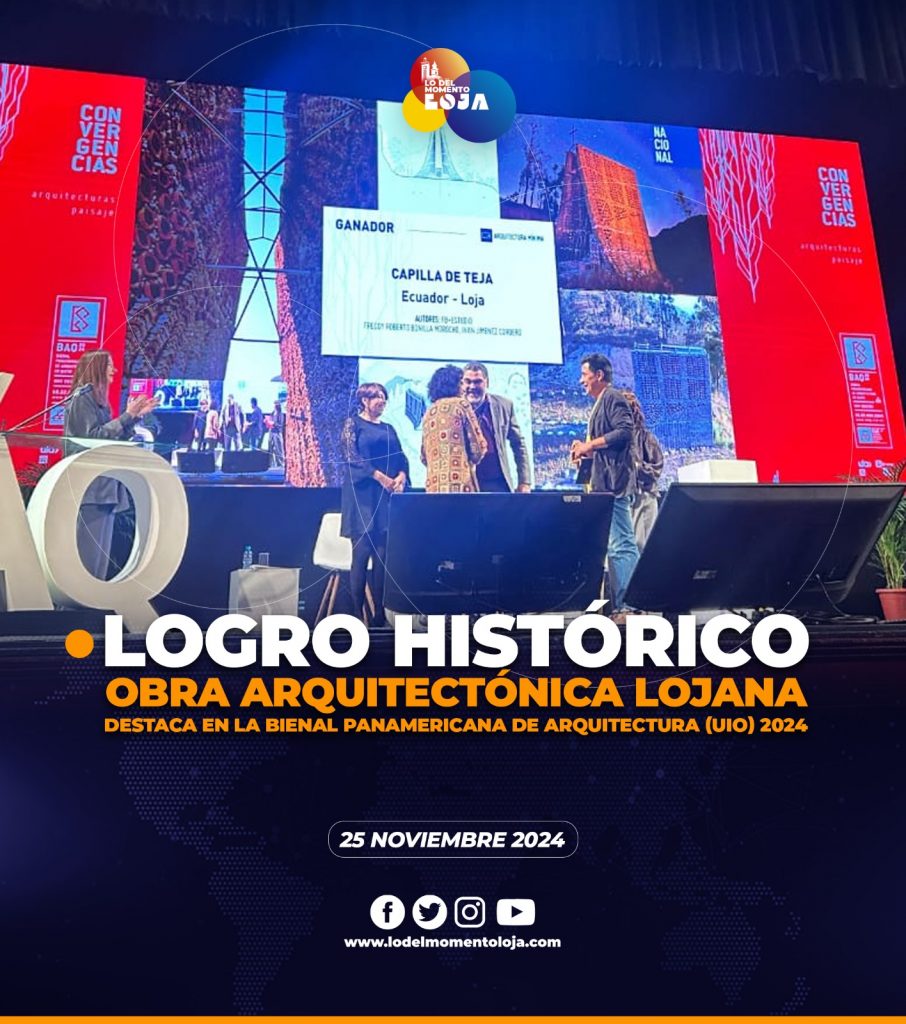 ¡Gran logro! El pasado 22 de noviembre, se registró un hecho histórico para la arquitectura lojana, puesto que la denominada ‘Capilla de Teja’, obra de arquitectura ubicada en Taquil (Loja), diseñada por los arquitectos Iván Jiménez y Freddy Bonilla, se alzó como triunfadora en la categoría ‘Arquitectura Mínima’ de la Bienal Panamericana de Arquitectura de Quito 2024, destacando entre 752 proyectos de 22 países inscritos en las diversas categorías, llevando el nombre de Loja a lo más alto del panorama arquitectónico nacional.