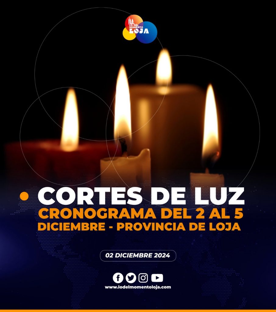 😱🕯️🌃 ¡Siguen los cortes de luz! La Empresa Eléctrica Regional del Sur S.A, ha anunciado la programación de cortes de energía eléctrica de la provincia de Loja, el cronograma es desde este lunes 02 al jueves 05 de diciembre 2024, mismo que se divide en dos horarios que varían durante el día y depende del sector, dejando un total de 7 horas sin energía eléctrica.