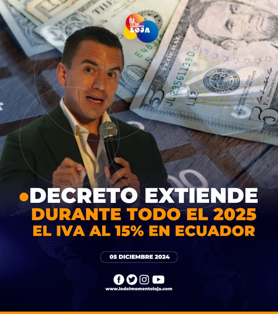 💵🫰🏻📈 ¡De un plumazo! Mediante Decreto Ejecutivo 470 firmado por el presidente Daniel Noboa, se ha dispuesto que el Valor Agregado (IVA) se mantenga al 15% durante todo el año 2025. Acción que lo realiza mediante la recomendación del Ministerio de Finanzas por la finanzas públicas y balanza de pagos. Cabe resaltar, que el hace ocho meses atrás, el presidente dispuso incrementar el IVA del 13% al 15% por el conflicto armado interno, para combatir la inseguridad.